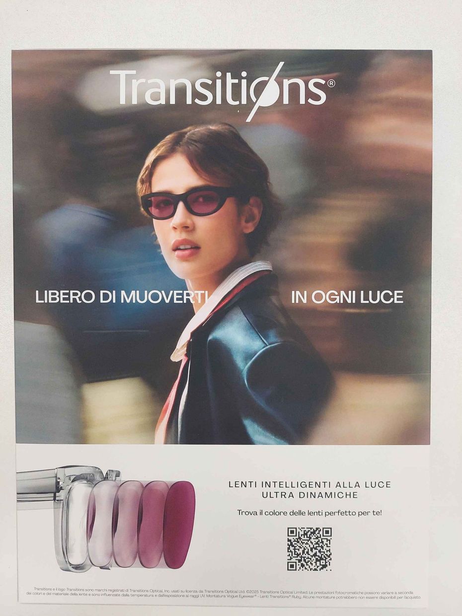 Venite a scoprire l'ultima generazione di lente fotocromatica Transition, 8 colori disponibili a seconda del tuo stile. Nel nostro punto vendita le troverai scontate del 50%